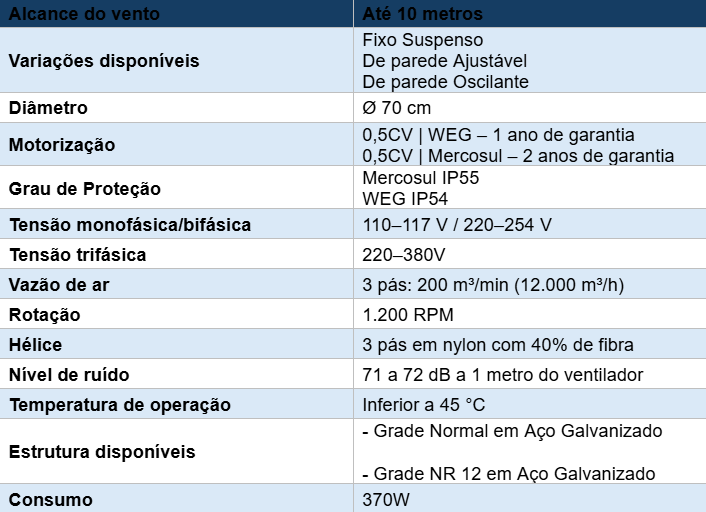 Ventilador fixo industrial desenvolvido para aplicações que exigem alta vazão de ar e elevada robustez construtiva, com estrutura totalmente em aço. Disponível nas versões fixo suspenso, de parede ajustável e de parede oscilante, nas versões monofásica ou trifásica.